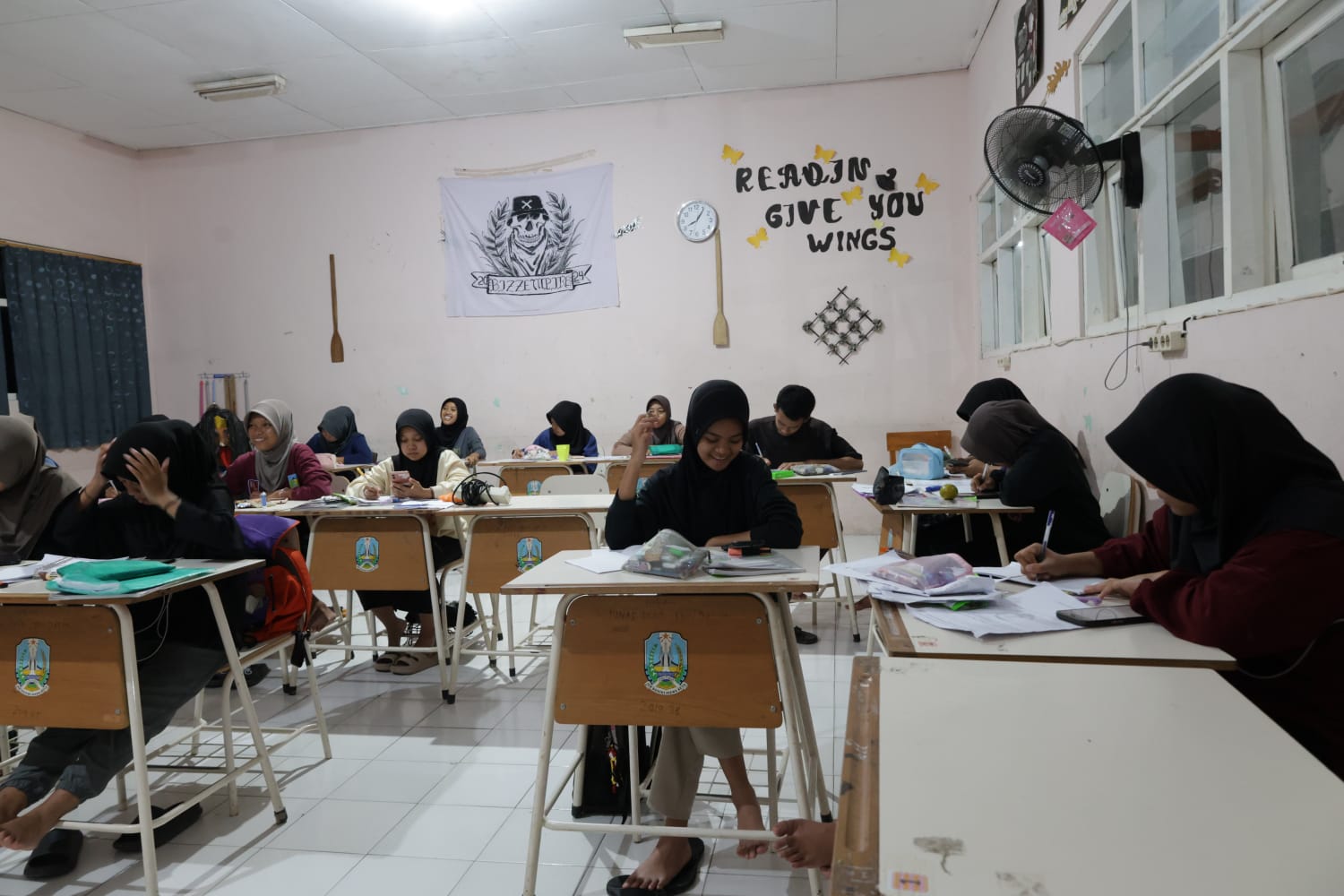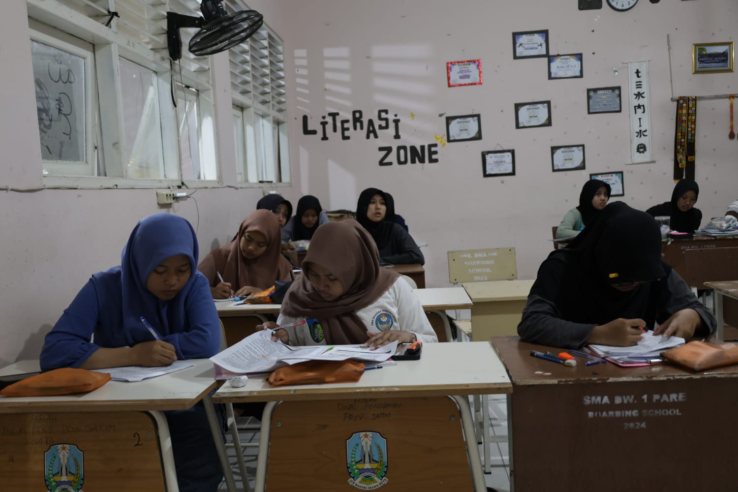 Suasana malam di asrama SMA Dharma Wanita 1 Pare Boarding School tampak hidup dengan semangat belajar para siswa yang tidak pernah surut. Dalam kegiatan rutin study night, para peserta didik berkumpul di ruang kelas dengan penuh kesadaran dan tanggung jawab untuk memperdalam materi pelajaran. Meski hari telah berganti malam, semangat mereka untuk menuntut ilmu tetap menyala, menciptakan atmosfer yang tenang namun produktif.